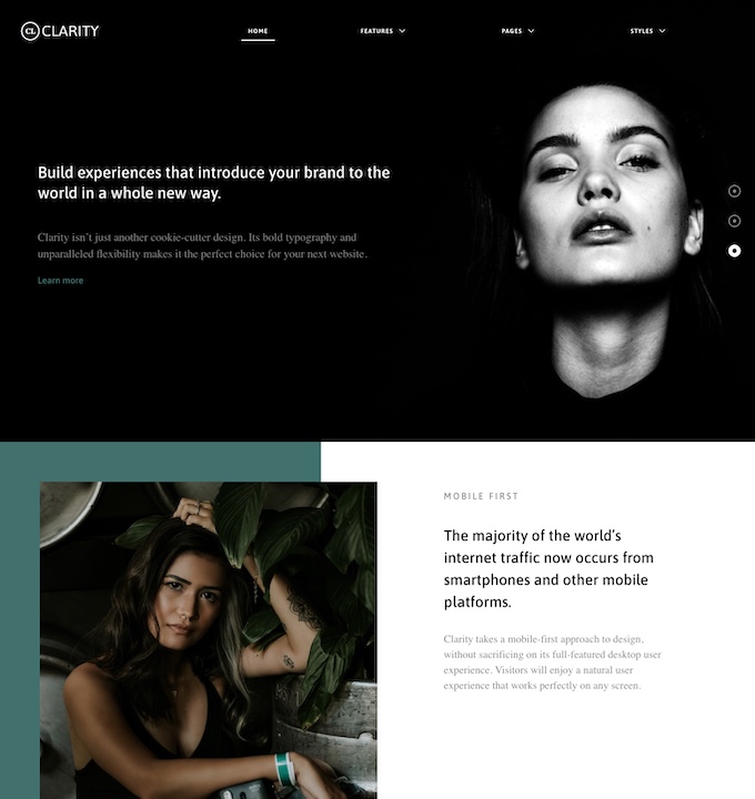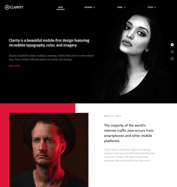 Clarity — это красивый мобильный дизайн с невероятной типографикой, цветом и изображениями. Десятки частиц позволяют легко создать потрясающий веб-сайт, который обслуживает ваш контент. Ваш веб-сайт будет идеально смотреться на мобильных устройствах, компьютерах и не только.